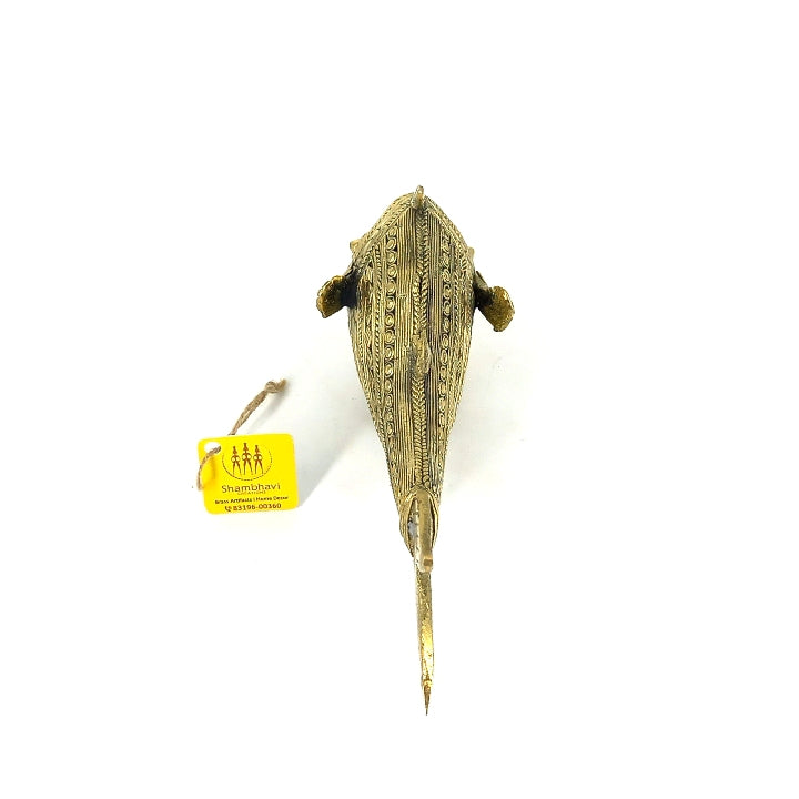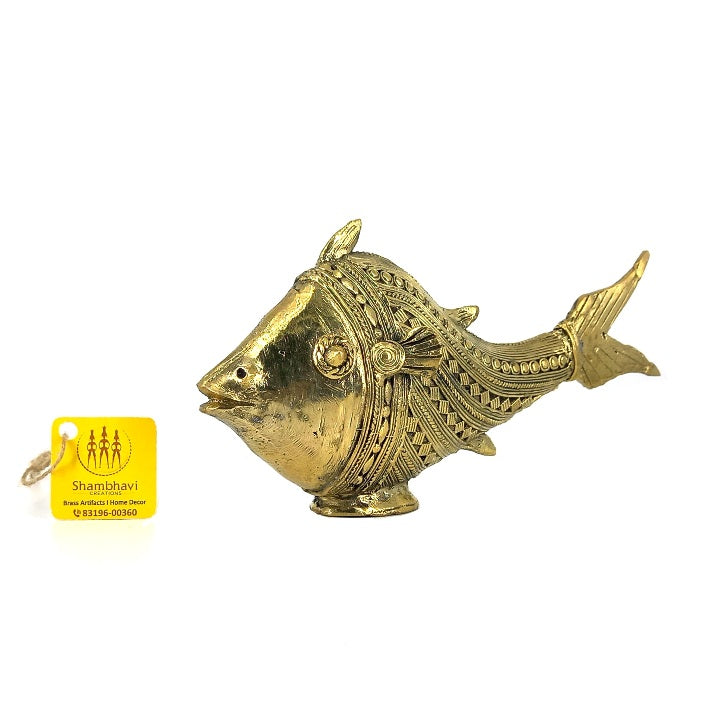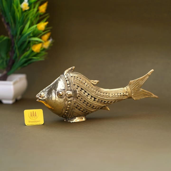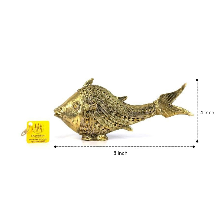 The Scaly Fish Dhokra Art Figurine is a curvaceous fish statue that features fluid lines like waves in the ocean. It features a large head with a body that tapers down to a thinner tail area and is covered in highly detailed scales, each detail applied by hand.