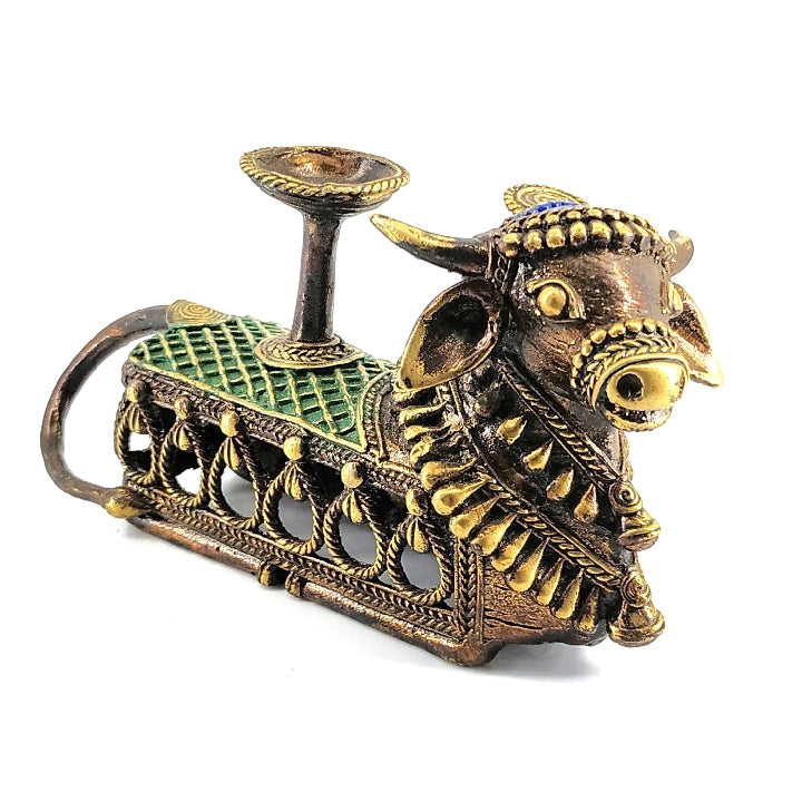 Handcrafted in brass, this sculpture features Nandi in a grounded resting form, thoughtfully designed to hold a tealight or diya on its back. The open lattice detailing allows the warm glow of the flame to gently filter through, creating a serene ambience. Hand-finished textures, braided metal patterns, and subtle green and blue accents reflect the depth and character of traditional metal casting.