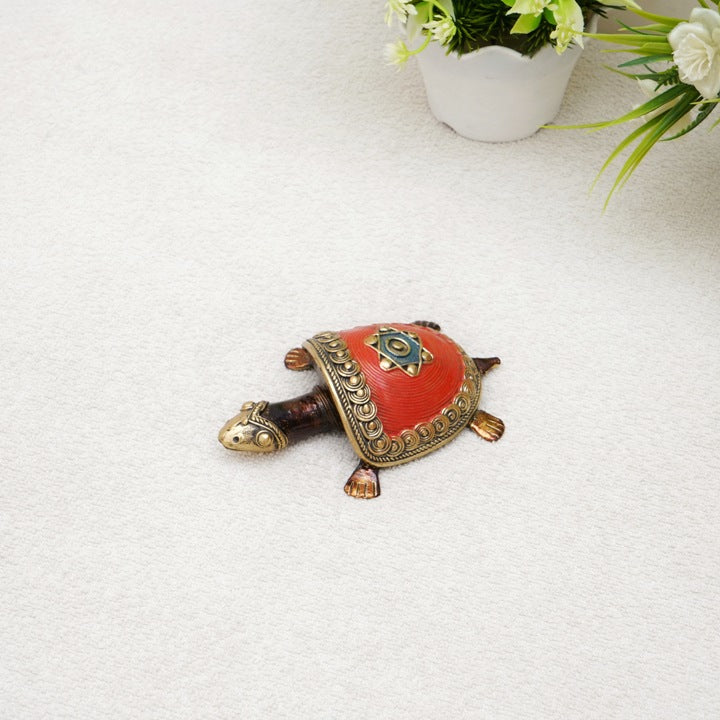 The rich red shell, adorned with rhythmic circular patterns and a symbolic coin motif, reflects prosperity, stability, and protection. The warm brass-toned metal beneath adds an earthy elegance, allowing this piece to blend seamlessly into both traditional and contemporary spaces. Whether placed on a work desk, console, or sacred corner, this tortoise becomes a gentle reminder to move forward with calm strength and balance.