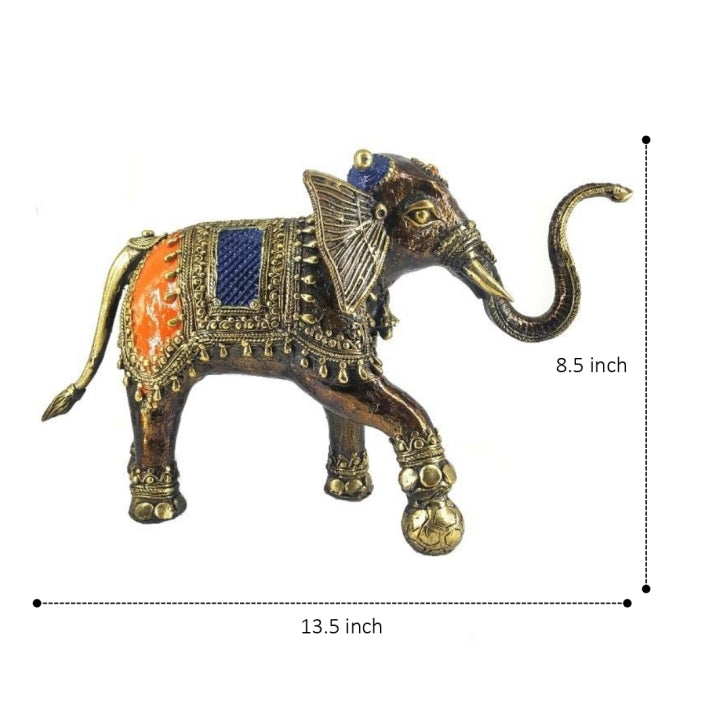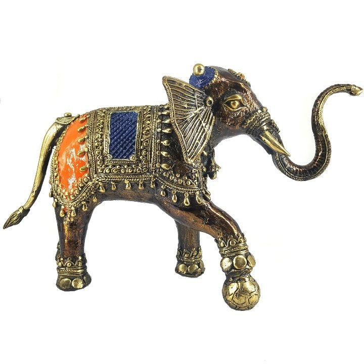 This Soccer Playing Elephant Dhokra Art Figurine depicts a colorful elephant enjoying a game of soccer as it moves the ball around with its foot. Draped across its back is a colorful blue and orange wrap with incredible detail applied by hand by way of traditional Indian dhokra art forms.
