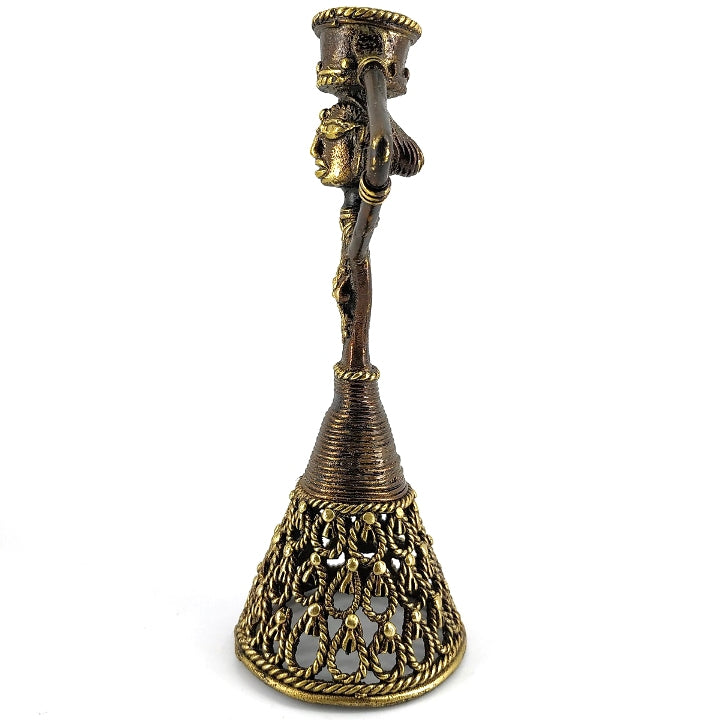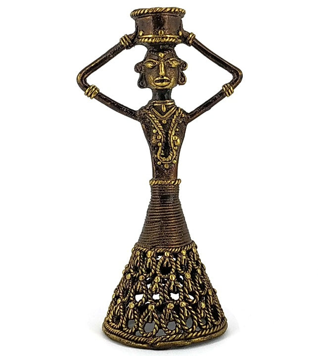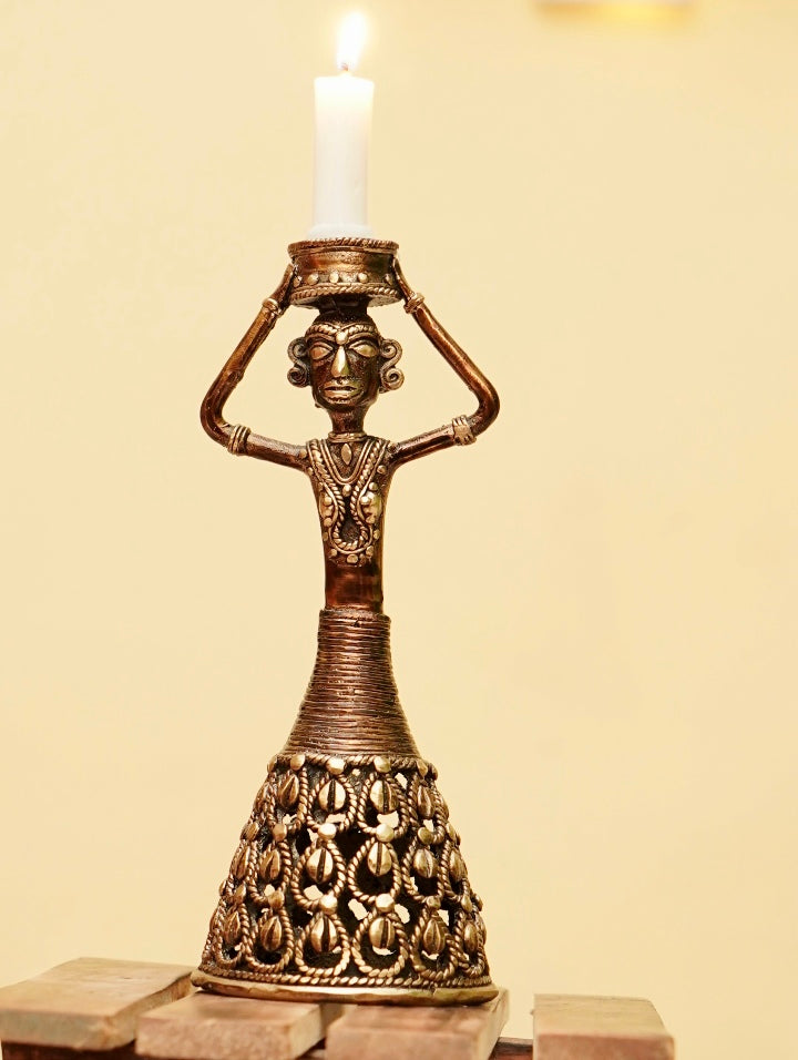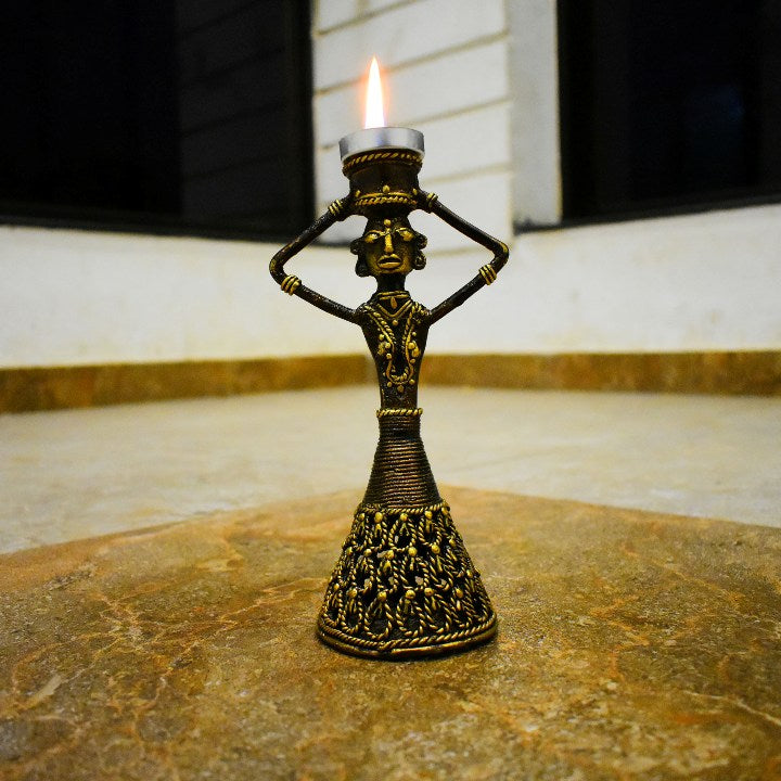 This Brass Woman Candle Holder from Shambhavi Creations reflects the elegance and strength of feminine presence—calm, grounded, and timeless. Crafted using the traditional Bastar Dokra art technique, the figure stands tall, holding light gently above her head, symbolising balance, care, and inner harmony.