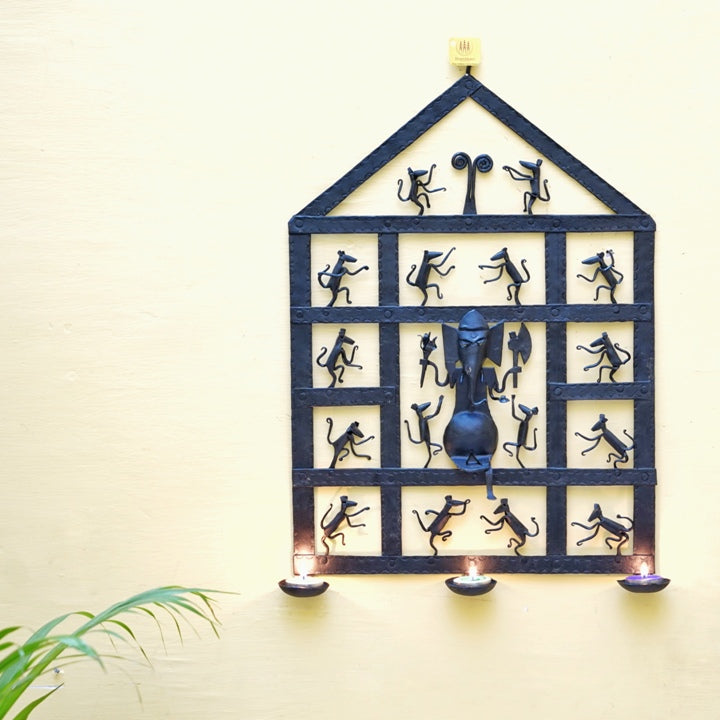 The Ganesha wall hanging can hold diya, t-light, or votive and will illuminate your home with light. The versatile wall hanging is not just a utility artefact but also a beautifully handcrafted piece of work!