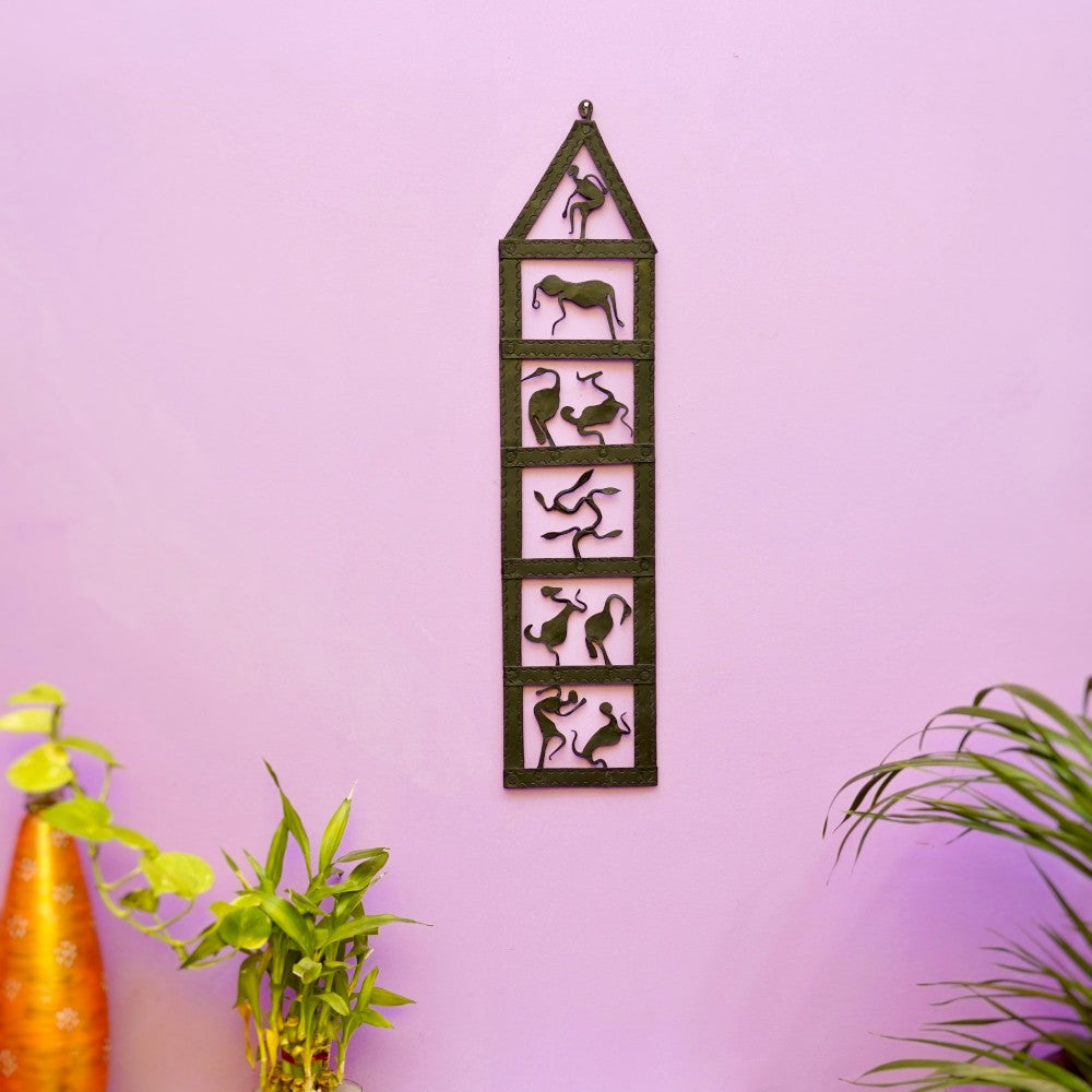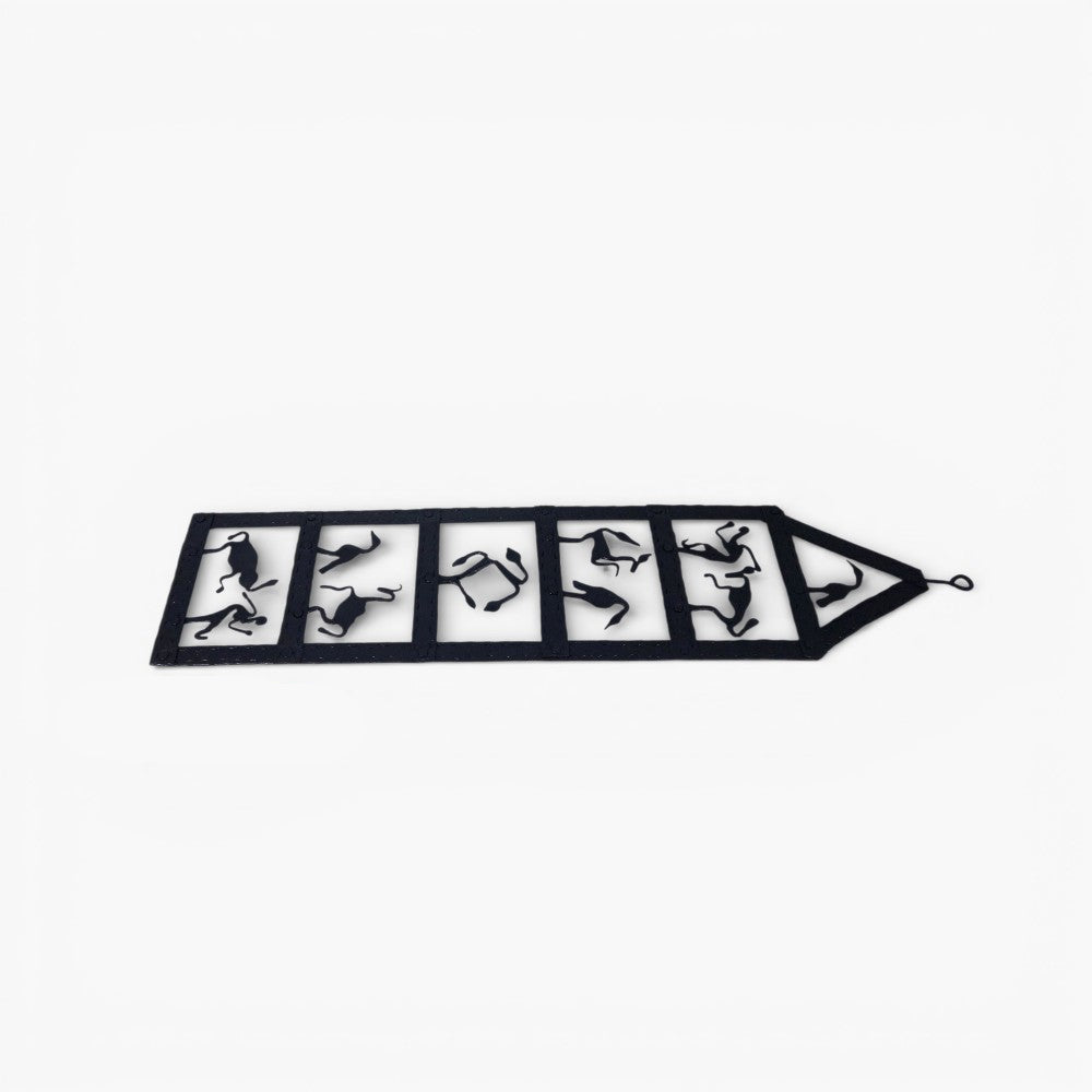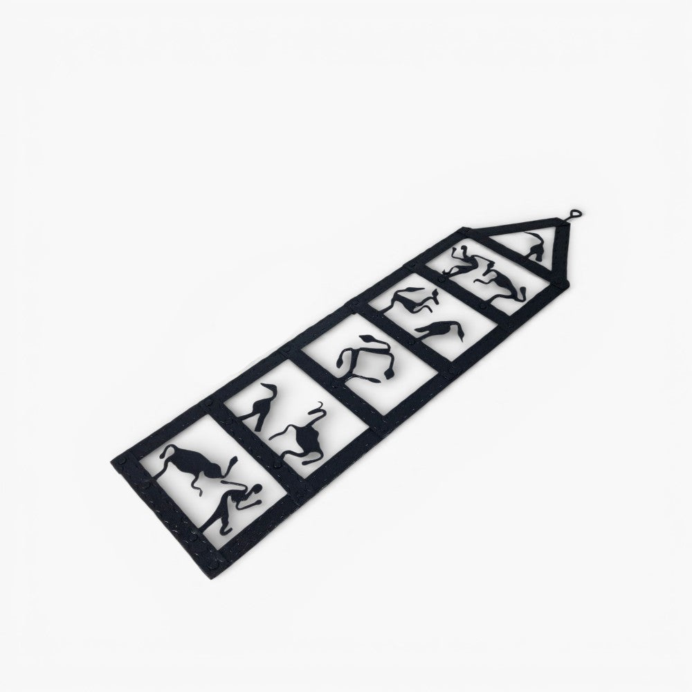 Designed and shaped by skilled artisans, this vertical wall panel features a sequence of expressive human and animal forms, each framed like a moment in time. The minimal black finish highlights the raw beauty of hand-forged iron, while the storytelling silhouettes reflect the soul of Bastar Dokra art, reimagined for modern homes.
