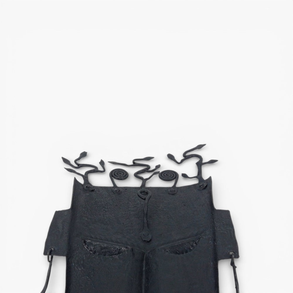 Expertly crafted by Tribal artisans from Chhattisgarh, India using traditional tools and techniques, this wall mask is made from wrought iron and handpainted in black with oil paint. The unique and striking design of this mask will make a statement on any wall.