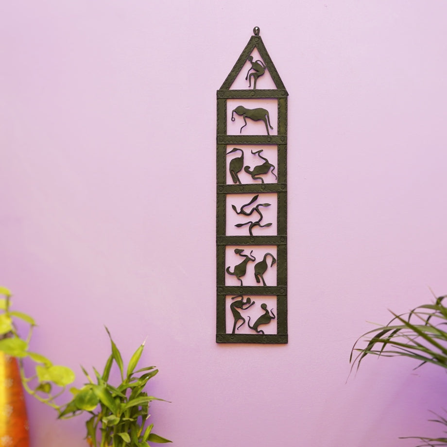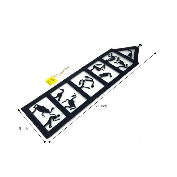 Designed and shaped by skilled artisans, this vertical wall panel features a sequence of expressive human and animal forms, each framed like a moment in time. The minimal black finish highlights the raw beauty of hand-forged iron, while the storytelling silhouettes reflect the soul of Bastar Dokra art, reimagined for modern homes.
