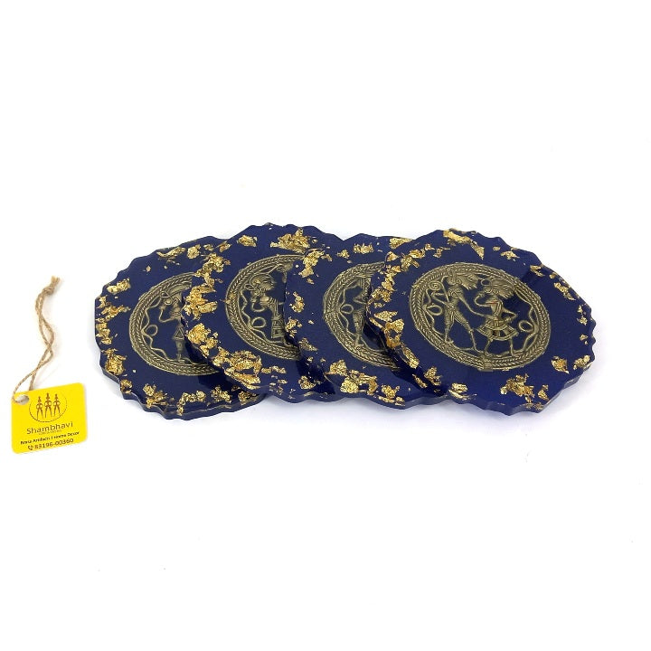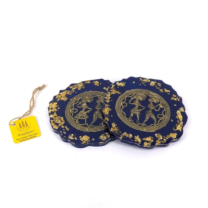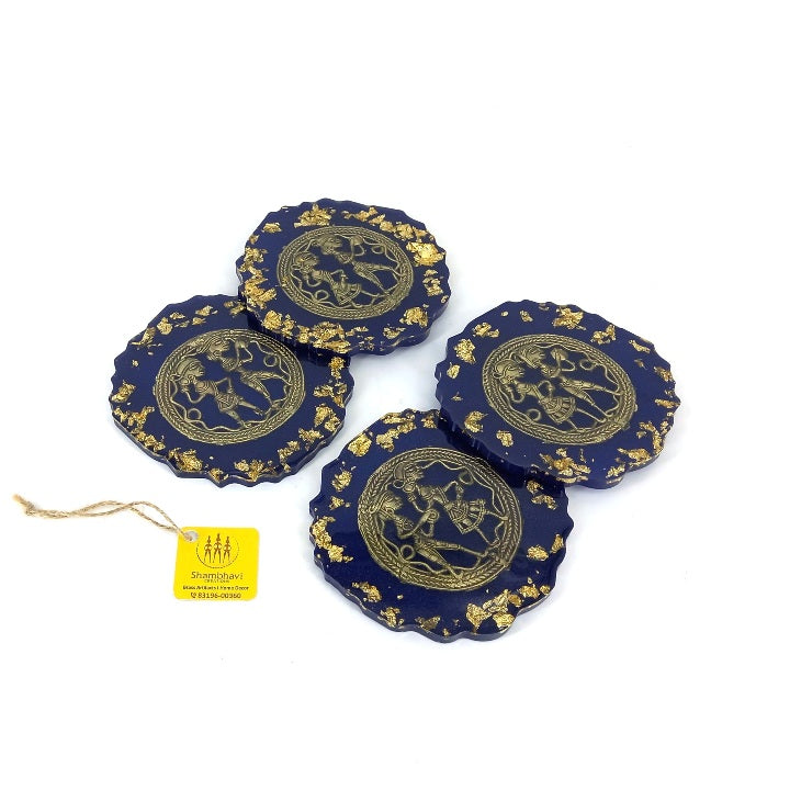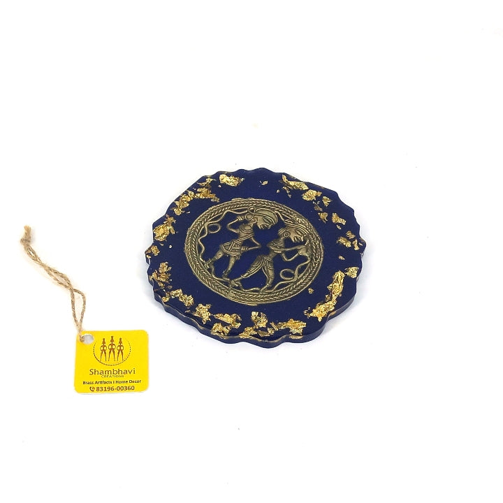 Each coaster features a deep blue translucent resin base, delicately accented with gold-toned highlights. At the center, a finely detailed brass motif reflects traditional storytelling forms, creating a striking contrast against the rich resin surface. The scalloped edges and hand-poured finish ensure that no two coasters are exactly alike.