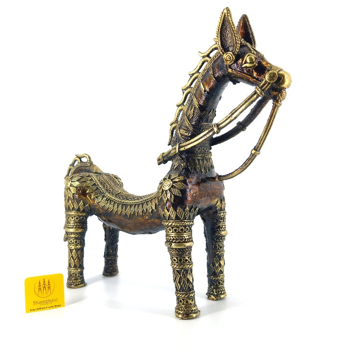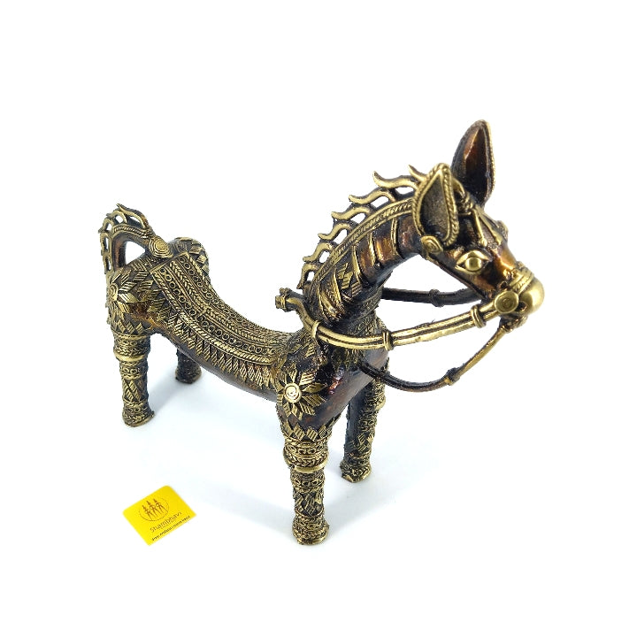 Handcrafted bronze brass horse statue with bent back shown in front three-quarter angle highlighting ornate dhokra metal detailing