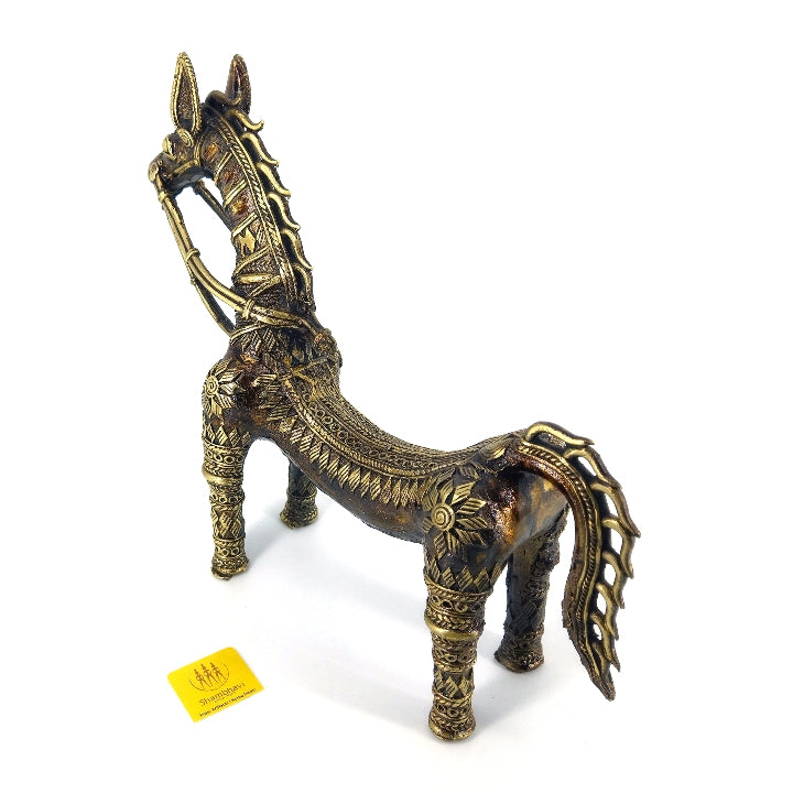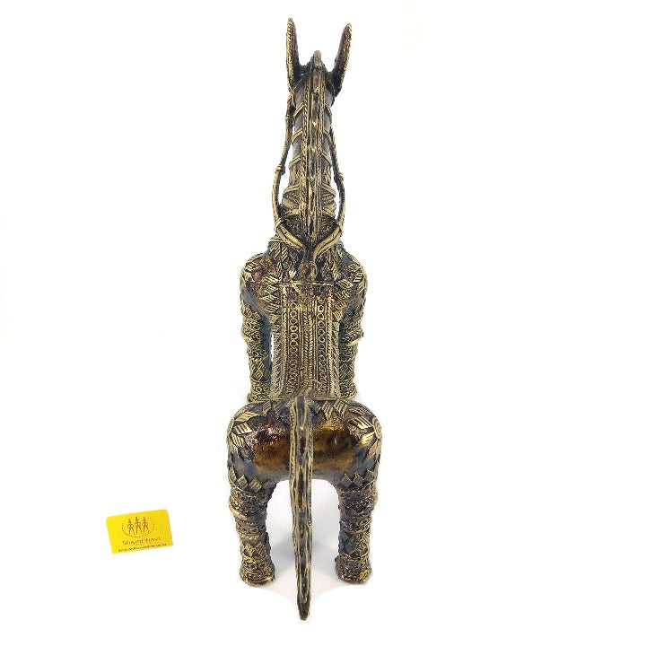 Back view of handcrafted brass horse statue with bent back highlighting symmetrical dhokra art motifs and sturdy leg form